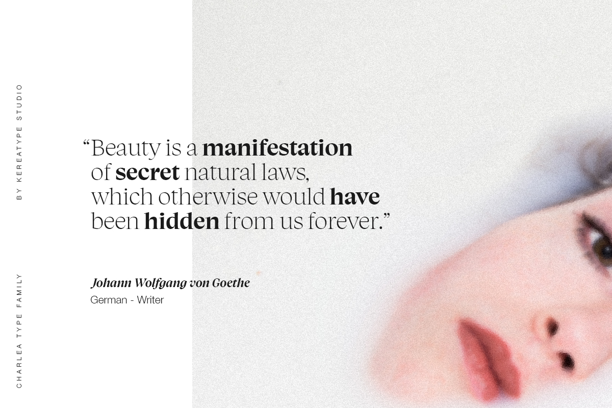 Charlea stands out with its distinctive serifs and subtle quirky details, offering a fresh take on classic beauty. Whether you’re designing for luxury branding, editorial magazines, beauty or fashion labels, wedding invitations, or high-end packaging, Charlea gives every word a graceful, memorable presence. With a perfect balance between timeless sophistication and playful individuality, Charlea is the ideal choice for designers who want their work to be both refined and visually striking.