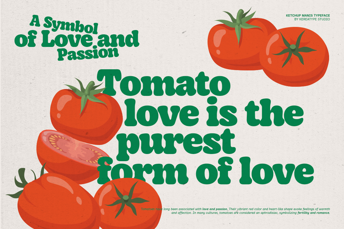 Ketchup Manis is a tasty vintage serif font inspired by the nostalgic charm of classic Cooper Black and retro aesthetics. Featuring chunky, rounded letterforms and a cheerful personality, it strikes a perfect balance between timeless warmth and modern appeal. Designed to be irresistibly friendly and approachable, this bold display font is ideal for F&B branding—from pizza and ice cream to tomato sauce labels—as well as children’s merchandise, band logos, and vibrant social media graphics. Whether you’re crafting playful packaging or a standout poster, Ketchup Manis adds a dash of sweetness and a memorable, joyful character to every creative project.