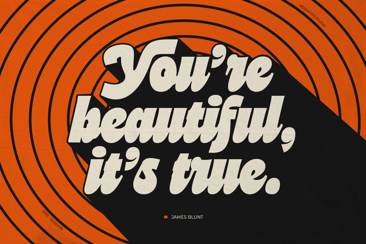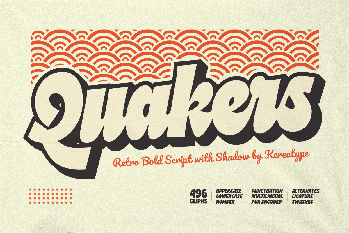 Quakers is a captivating evolution of the ‘Cuanky’ style, transformed into a bold script display typeface that radiates vintage elegance and modern artistic flair. Featuring high-contrast strokes and distinctive, expressive shapes, this font makes every word a statement in luxury branding, editorial layouts, and high-end fashion design. It comes equipped with a time-saving shadow effect, allowing you to effortlessly turn product packaging, wedding invitations, and signage into nostalgic masterpieces. Whether for retro-themed businesses or sophisticated modern headlines, Quakers bridges the gap between refined artistry and bold, timeless sophistication.